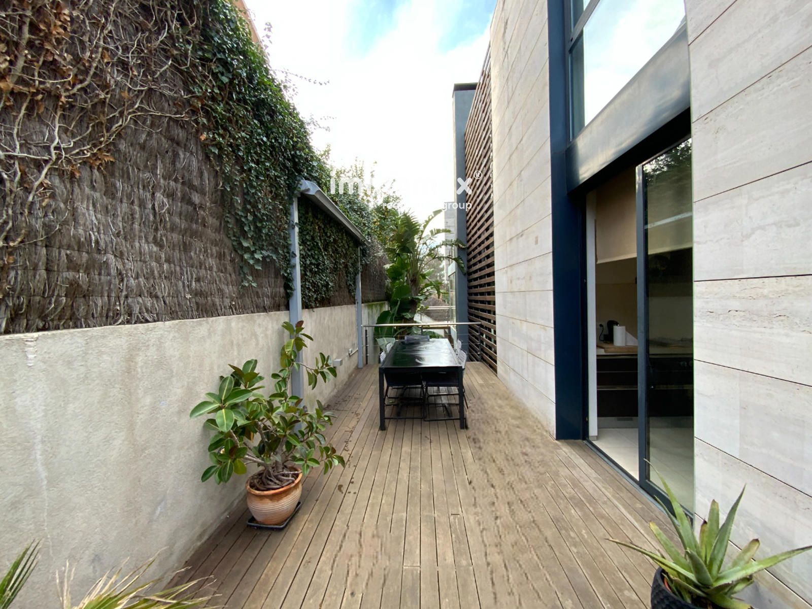 Los suelos de la terraza, de madera tropical, junto con su cuidada carpintería exterior, refuerzan el estilo moderno de la vivienda y la calidad de sus acabados, ofreciendo un hogar elegante y confortable.