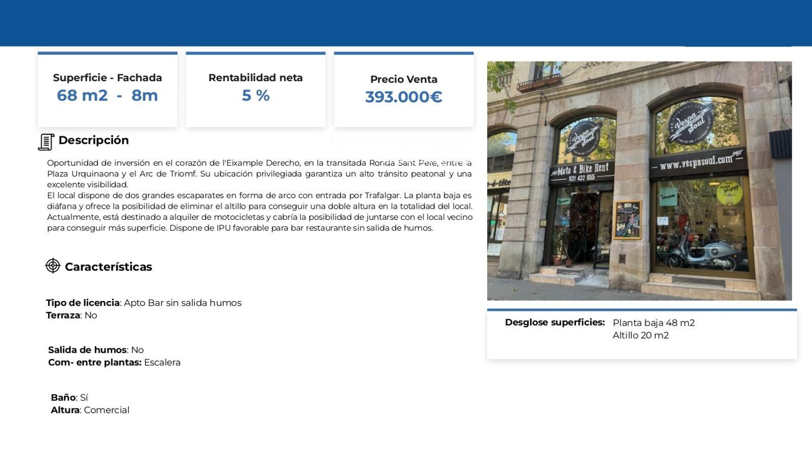 Dispone de IPU favorable para actividad de bar-restaurante sin salida de humos, lo que amplía las posibilidades de explotación comercial.