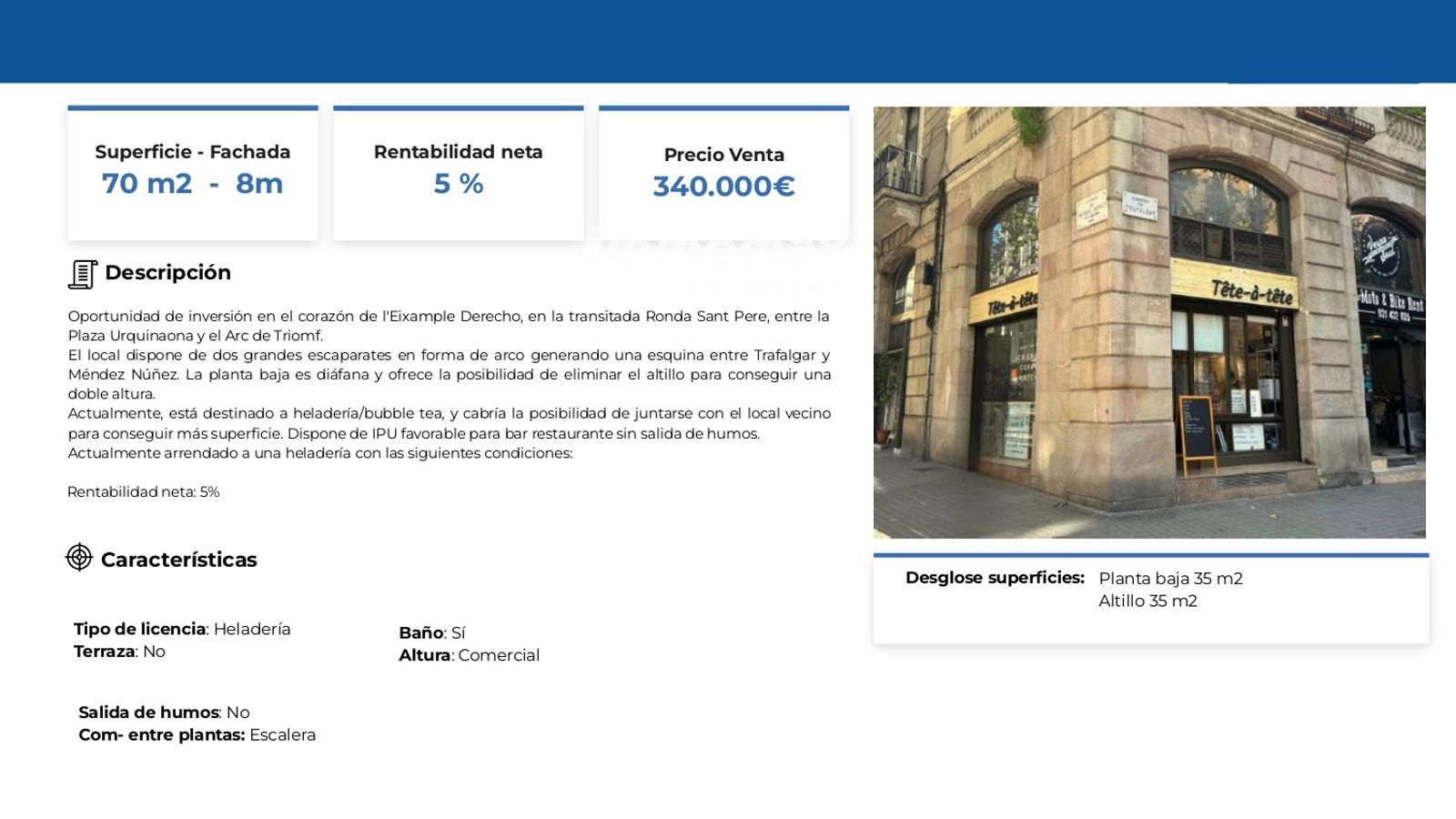 Actualmente se encuentra arrendado y en funcionamiento como heladería/bubble tea, en una ubicación consolidada para este tipo de actividad. Existe además la opción de unirlo con el local colindante, lo que aporta un interesante potencial de crecimiento y reposicionamiento del activo. El local dispone de IPU favorable para actividad de Bar- restaurante sin salida de humos.