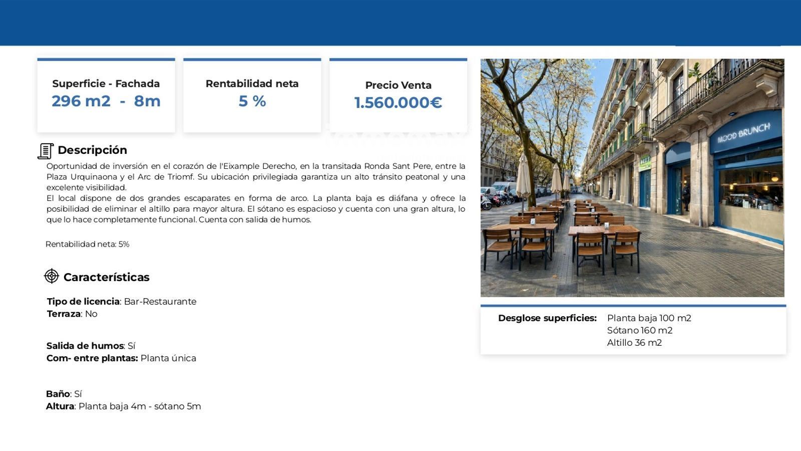 El inmueble dispone de salida de humos, un valor diferencial que amplía significativamente las posibilidades de uso, especialmente en el sector de restauración.